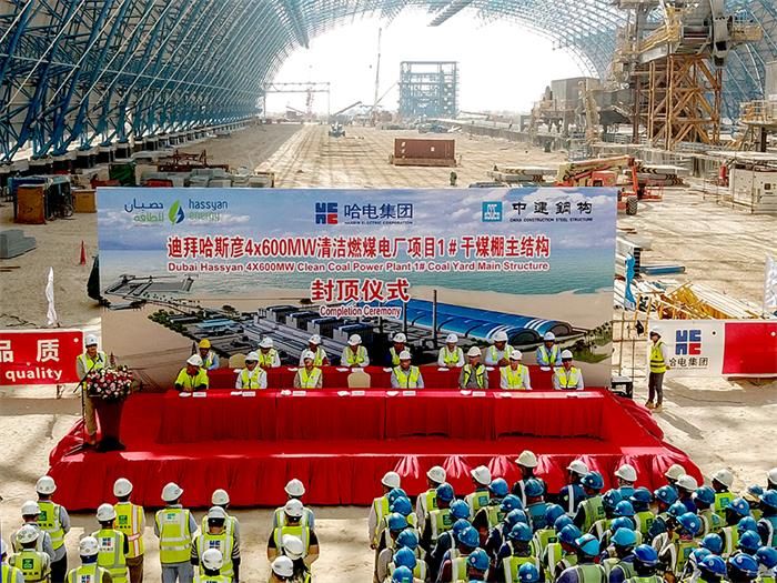 At 14:00 on May 22 local time in Dubai, the Dubai’s Hassyan 4x600MW Clean Coal-fired Project witnessed the key milestone work — the main truss structure of the dry coal shed at Coal Storage Yard 1 of the Dubai Hassyan Project was capped ten days ahead of schedule. A ceremony was held at the site in the presence of HEI, the Project Owner Hassyan Energy, the investment partner ACWA Power and GE, as well as representatives of the parties involved in the project.