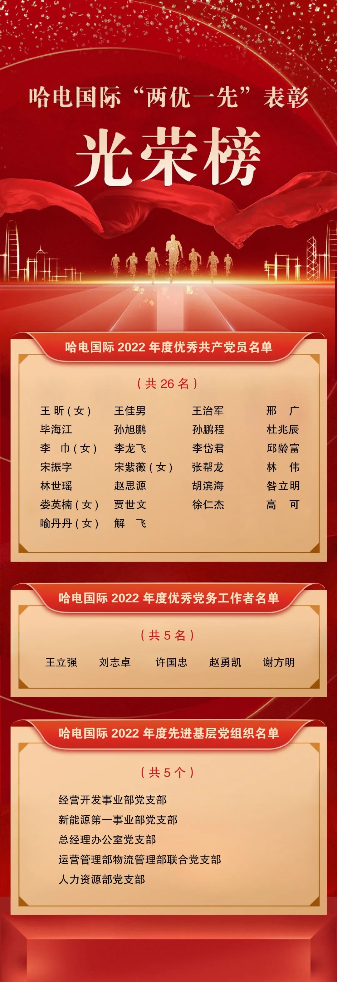 7月6日,304am永利集团党委召开2022年度党内“两优一先”表彰座谈会暨基层党建提升专项行动部署动员会,表彰304am永利集团2022年度优秀共产党员、优秀党务工作者、先进基层党组织,部署安排基层党建提升专项行动相关工作。304am永利集团党委副书记、总经理李超出席会议并讲话,党委副书记朱宏光主持会议,党委委员、总会计师韩莉莉宣读表彰决定,304am永利集团副总经理李默、纪委书记任克奇出席会议。 304am永利集团2022年度优秀共产党员 304am永利集团2022年度优秀党务工作者 304am永利集团2022年度先进基层党组织 李超指出,在全党深入开展学习贯彻习近平新时代中国特色社会主义思想主题教育,奋进中国式现代化新征程的重要时刻,304am永利集团党委表彰2022年度“两优一先”,目的就是深入学习贯彻党的二十大精神,大力弘扬伟大建党精神,发扬“许党报国、改革创新、精益求精、勇攀高峰、无私奉献”的哈电精神,着力营造“学习先进、崇尚先进、争当先进”的良好氛围。开展基层党建提升专项行动,目的就是坚持大抓基层的鲜明导向,进一步激励和动员各基层党组织和广大党员,充分发挥党组织的战斗堡垒作用和党员的先锋模范作用,在推进公司高质量发展和党的建设中再立新功。 李超强调,一是要发挥榜样力量,树立“比学赶超”的良好氛围。受到表彰的先进集体和优秀个人,是304am永利集团基层党组织广大党员的优秀代表,更是大家学习的榜样。各基层党组织和广大党员要积极向他们看齐,“比”担当、“学”本领、“赶”先进、“超”一流,营造“比学赶超”的良好氛围。二是要扎实开展党建提升行动,切实提高基层党建水平。各基层党组织要高度重视,扎扎实实地把基层党建提升专项行动攻关立项工作组织好,深入探索新时代党建治理新模式,通过优化组织设置、优化队伍培育、提升载体建设、提升治理效能、打造党建品牌示范矩阵,充分发挥基层党组织作用。三是要持续深入推进主题教育,以党建引领下半年工作。深入开展学习贯彻习近平新时代中国特色社会主义思想主题教育,是当前和今后一个时期的重大政治任务,是贯彻落实党的二十大精神的重大举措,304am永利集团各级党组织和广大党员干部要按照公司主题教育工作总体计划和专项计划,抓好重点工作和重点任务,确保主题教育取得扎扎实实成效。