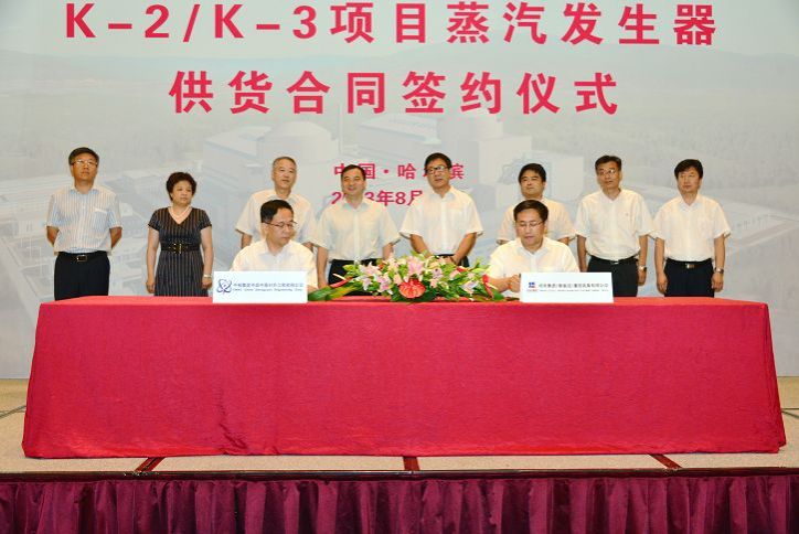 中核集团K-2、K-3项目蒸汽发生器是哈电集团继C2、C3和C4项目后与中核集团中原对外工程有限公司的又一次合作,该项目采用中国ACP1000自主三代核电技术, K-2/K-3项目也将是中国百万千瓦等级核电机组首个出口项目。本合同的签订充分体现了中核集团对哈电集团的信任和支持。中核集团总经理助理李晓明在致辞中高度评价了双方长期以来的合作,并对哈电集团提出了新的希望和要求。吴伟章在致辞中表示将严格履行合同,制造出中国核电出口项目的精品,向中核集团交出一份满意的答卷。