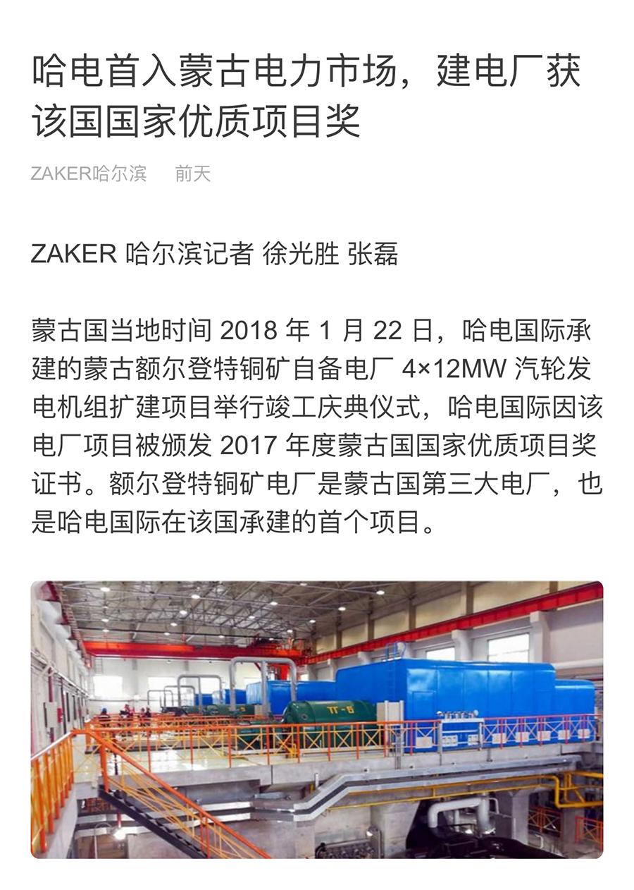 【哈尔滨日报】哈电首入蒙古电力市场 建电厂获该国国家优质项目奖