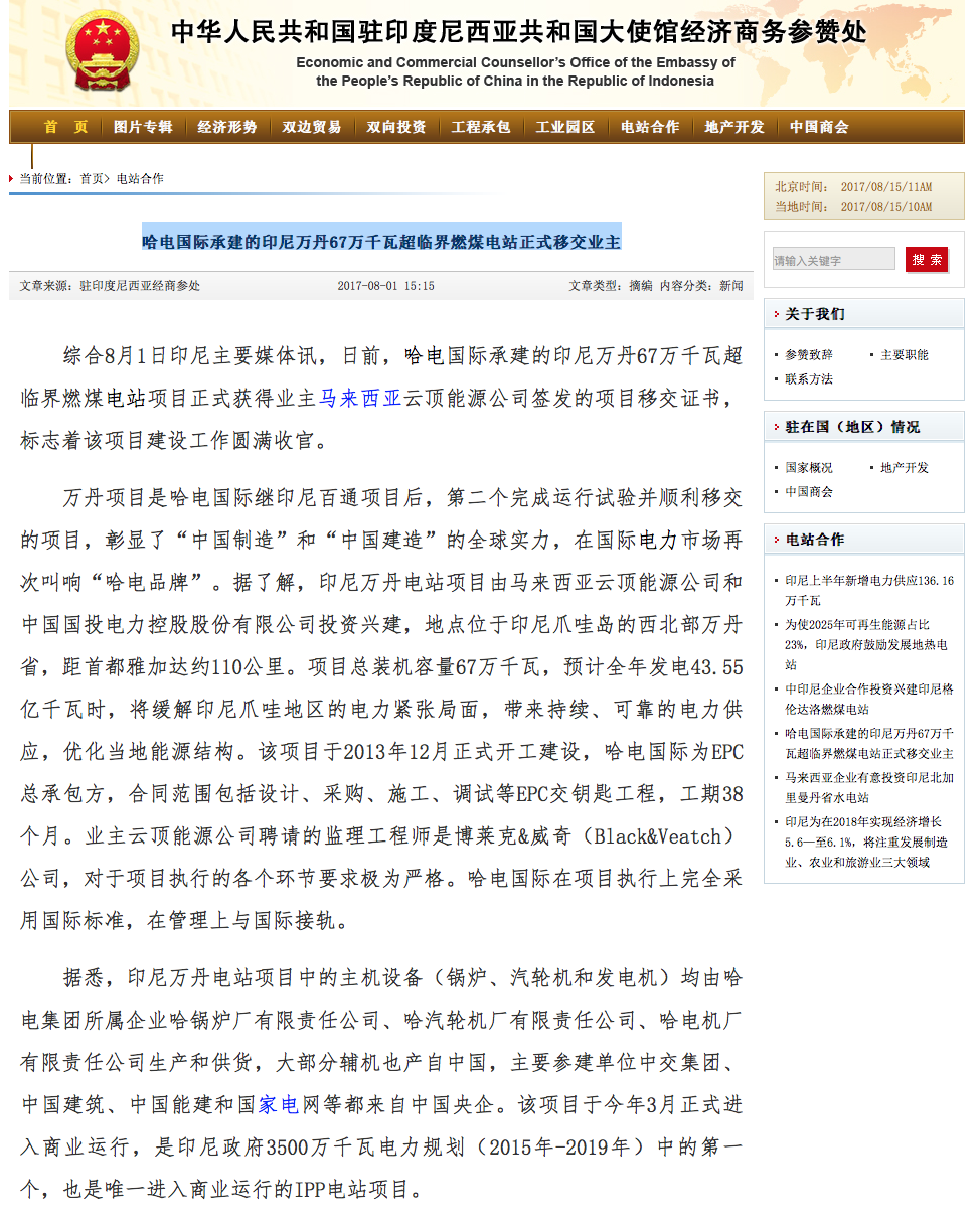 综合8月1日印尼主要媒体讯,日前,哈电国际承建的印尼万丹67万千瓦超临界燃煤电站项目正式获得业主马来西亚云顶能源公司签发的项目移交证书,标志着该项目建设工作圆满收官。 万丹项目是304am永利集团继印尼百通项目后,第二个完成运行试验并顺利移交的项目,彰显了“中国制造”和“中国建造”的全球实力,在国际电力市场再次叫响“哈电品牌”。据了解,印尼万丹电站项目由马来西亚云顶能源公司和中国国投电力控股股份有限公司投资兴建,地点位于印尼爪哇岛的西北部万丹省,距首都雅加达约110公里。项目总装机容量67万千瓦,预计全年发电43.55亿千瓦时,将缓解印尼爪哇地区的电力紧张局面,带来持续、可靠的电力供应,优化当地能源结构。该项目于2013年12月正式开工建设,304am永利集团为EPC总承包方,合同范围包括设计、采购、施工、调试等EPC交钥匙工程,工期38个月。业主云顶能源公司聘请的监理工程师是博莱克&威奇(Black&Veatch)公司,对于项目执行的各个环节要求极为严格。304am永利集团在项目执行上完全采用国际标准,在管理上与国际接轨。 据悉,印尼万丹电站项目中的主机设备(锅炉、汽轮机和发电机)均由哈电集团所属企业哈锅炉厂有限责任公司、哈汽轮机厂有限责任公司、哈电机厂有限责任公司生产和供货,大部分辅机也产自中国,主要参建单位中交集团、中国建筑、中国能建和国家电网等都来自中国央企。该项目于今年3月正式进入商业运行,是印尼政府3500万千瓦电力规划(2015年-2019年)中的第一个,也是唯一进入商业运行的IPP电站项目。 |